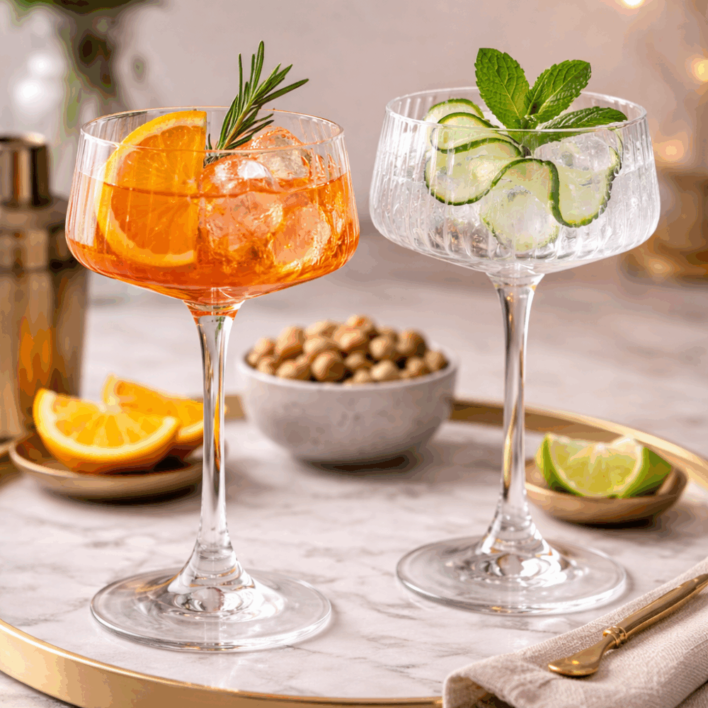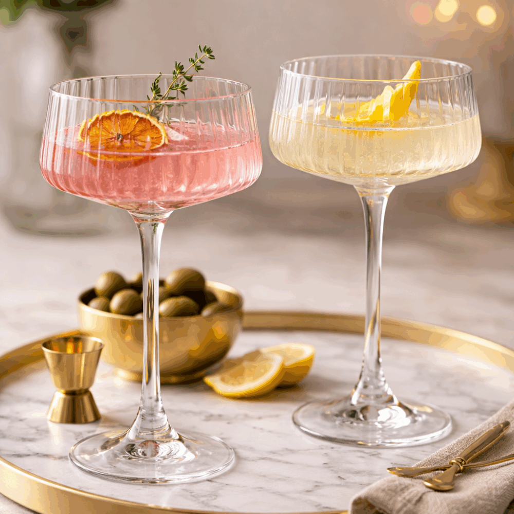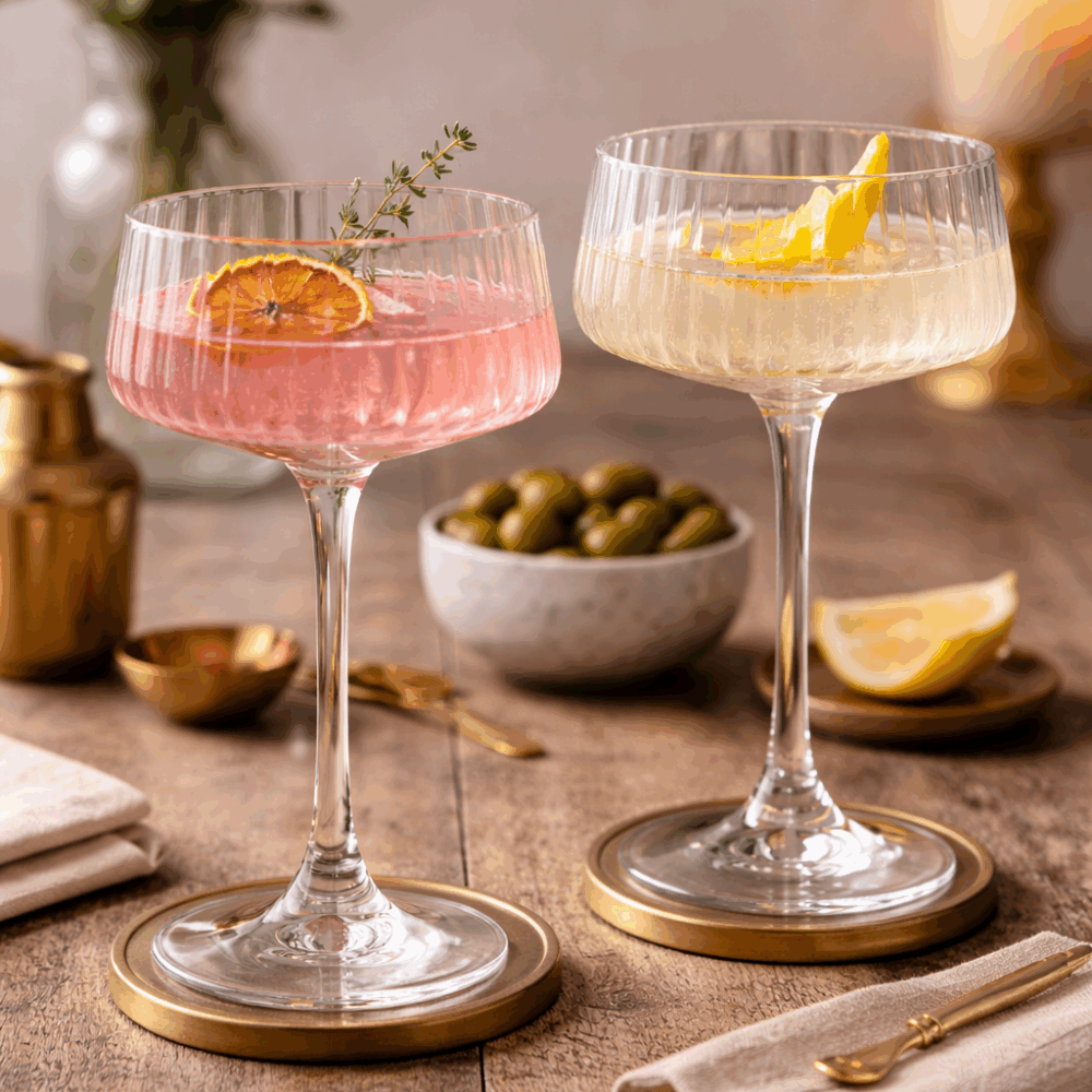 This set of two crystal champagne saucers feature our glamourous Mirage design. Champagne has been traditionally served in saucers like these. It is only recently that tall champagne flutes began to dominate. As retro designs are ever-so-popular, we’ve created this set of stunning champagne saucers. Now you can dine in style while admiring the optical ripple effect, much like a ‘mirage’, hence the name of the collection. These saucers are perfect for a variety of your favourite cocktails and serving small appetisers or ice-cream. Crafted from premium ultra clear blown lead free crystal and packaged in a beautiful gift box. Discover our range of champagne saucers here.